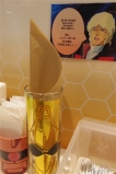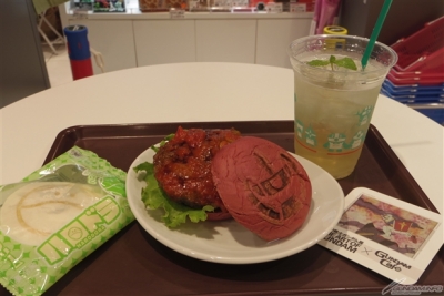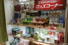 享用「番茄漢堡~夏亞專用薩克漢堡~」、「哈囉銅鑼燒」和鋼彈展的「砂之十字架~『給我一杯水』~」!牆壁和小東西也值得注目!商品販售區也相當的充實!