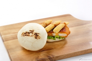 ■用特製小圓麵包加入玉米筍和炸雞排若鶏做成三明治。