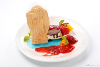 ■鋼彈模型最中和水果醬的冰淇淋拼盤。鋼彈身後有冰淇淋!還有豐富的芒果、草莓等水果!