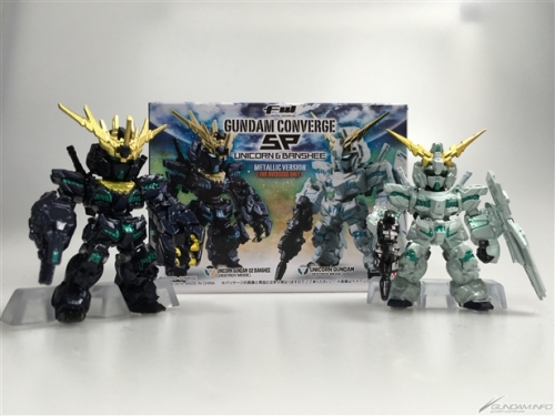 FW GUNDAM CONVERGEシリーズの海外限定アイテムで、「ユニコーンガンダム」と「バンシィ」の2体セット。いずれもメタリック塗装で、ユニコーンガンダムのサイコフレーム部分は最終決戦をイメージした緑色となっている。
