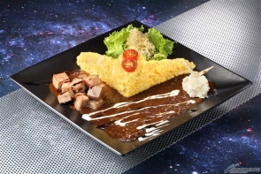 【左】<秋葉原・大阪>漆黑的虛影 ~精神感應(315g)鋼彈黑咖哩 佐骰子牛排~ 價格:1,296日圓(含稅)