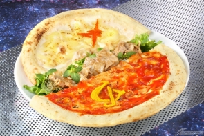 【右】<大阪>梅比烏斯的彼方 ~克瓦特羅Formaggio和特製番茄醬HALF&HALF比薩~ 價格:1,080日圓(含稅)