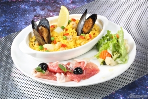 【左】<秋葉原・大阪>奇波亞·桑特的餐桌 ~西班牙炒飯及生火腿沙拉~ 價格:1,080日圓(含稅)