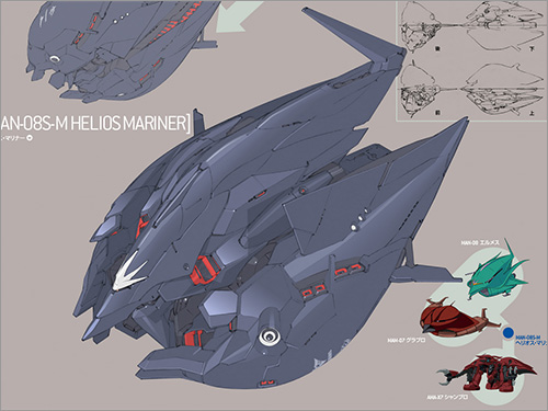 本機是火星獨立吉翁軍為了投入INLE奪還作戰,而將預想作為「MAN-08 艾爾梅斯」後繼機,所開發的新人類專用MA「MAN-08S 海里歐斯」,進行水中用改造的機體。經過改造後,達成機體氣密性和各種推進器在水中的應對,左右莢艙還搭載了「電磁流體誘導推進器(MHD)」。