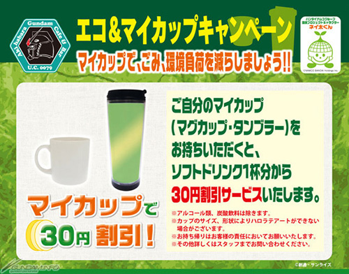 鋼彈官方咖啡廳「GUNDAM Café 秋葉原店」、「GUNDAM Café DIVER CITY東京 PLAZA店」和大阪「GUNDAM SQUARE」實施中的「環保&自備飲料杯優惠活動」,6月5日(一)起將展開「GUNDAM Café環境月」和現在舉辦的「新機動戰記鋼彈W~邁向永遠的回歸活動~」的連動計畫現正實施中。