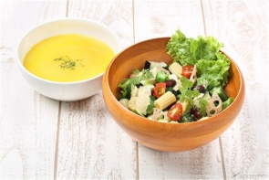 【左】3丁目的犒賞沙拉 ~豐富夏季蔬菜的細切沙拉 附冷湯~