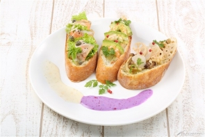 【右】豪華喵日普切塔 ~鮮蝦酪梨、煙燻鮭魚、帆立貝蘑菇的普切塔~