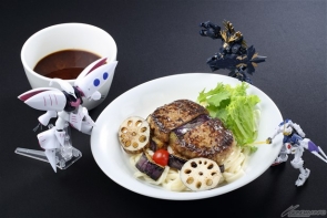 持續不懈地追求亞凱的GUNDAM Café,今夏將送上的新風格料理──正是本盤咖哩烏龍麵!份量滿點的巨大漢堡排,請務必沾上強調和風高湯風味的咖哩來一起享用。