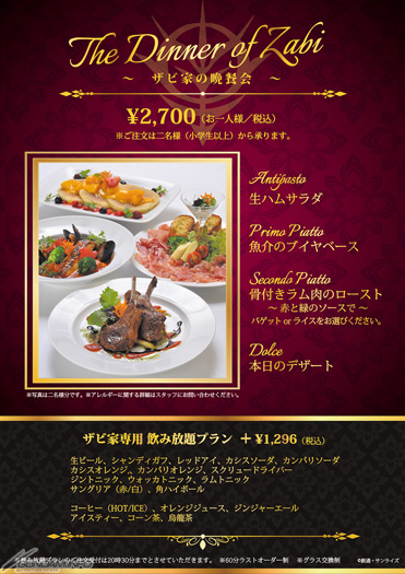 本餐點能享用重現薩比家餐桌的高級豪華全餐料理,限定17:00至21:00的晚餐時段供應。