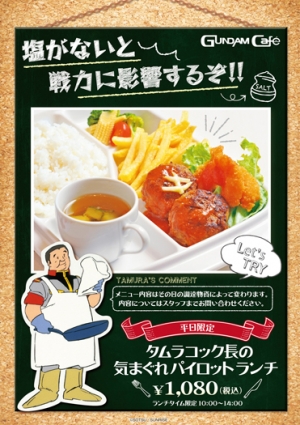 鋼彈官方咖啡廳「GUNDAM Café 秋葉原店」,將推出以『機動戰士鋼彈』宇宙戰艦白色基地内掌廚的“田村料理長”,其所做的料理為形象來設計的餐點「田村料理長的善變駕駛員午餐」,並於1月16日(二)起在平日限定菜單中登場。價格為1,080日圓(含稅)。