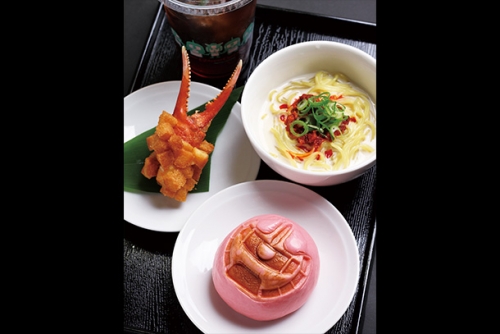 「鋼彈飲茶套餐」裡有肉包、湯麵、芝麻團子、烏龍茶。「夏亞專用薩克飲茶套餐」則有豆沙包、豆漿担担麵、炸蟹爪、烏龍茶。價格皆為1,080日圓(含稅)。