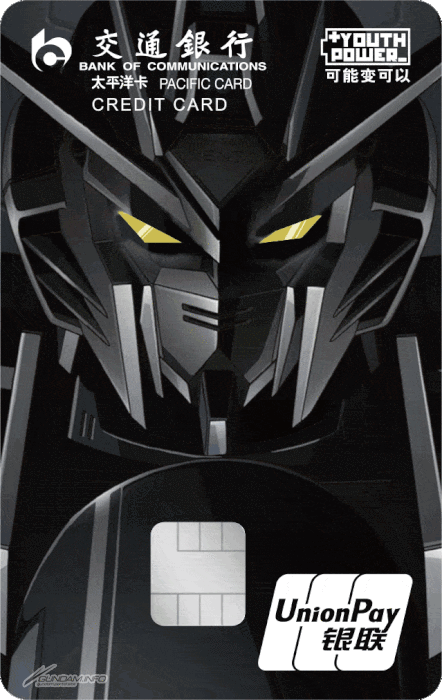 擁有超過100年歷史的中國五大銀行之一「交通銀行」,推出鋼彈圖案的信用卡。利用光柵動態圖效果,從不同角度觀看還可以看到雙眼發光的特效!