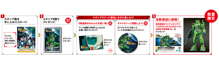 集章馬拉松活動中把登場自『機動戰士鋼彈』『機動戰士Ζ鋼彈』等作品的人氣角色化為印章,全部設置在65處車站,只要收集滿即可獲贈山手線E235系配色的「全車站完成獨家鋼彈模型[1/144 RX-78-2 E235鋼彈JR東日本專用機 Ver.]」。