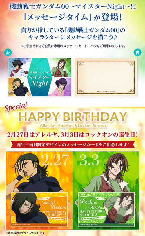 「機動戰士鋼彈00 ~尖兵Night~」將實施寫下訊息給喜歡角色的「訊息時間」此外,於舉辦期間中的2月27日(四)和3月3日(二)迎接生日的” 阿雷路亞·帕普提茲姆”和” 洛克昂·史特拉托斯”將會有生日限定款式的訊息卡片登場,生日當天即可獲得限定款式的訊息卡片。