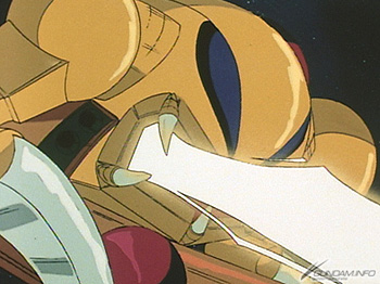 被放棄的機動裝甲,薩克雷洛單挑白色基地。在機動兵器之中大放異彩的獨特設計是意外的強敵。這次足部套上G裝甲戰機B組件的鋼彈也登場,本來鋼彈的機體只能正面組裝、這次則改為逆向組裝。是只有這回出現的特殊合體。