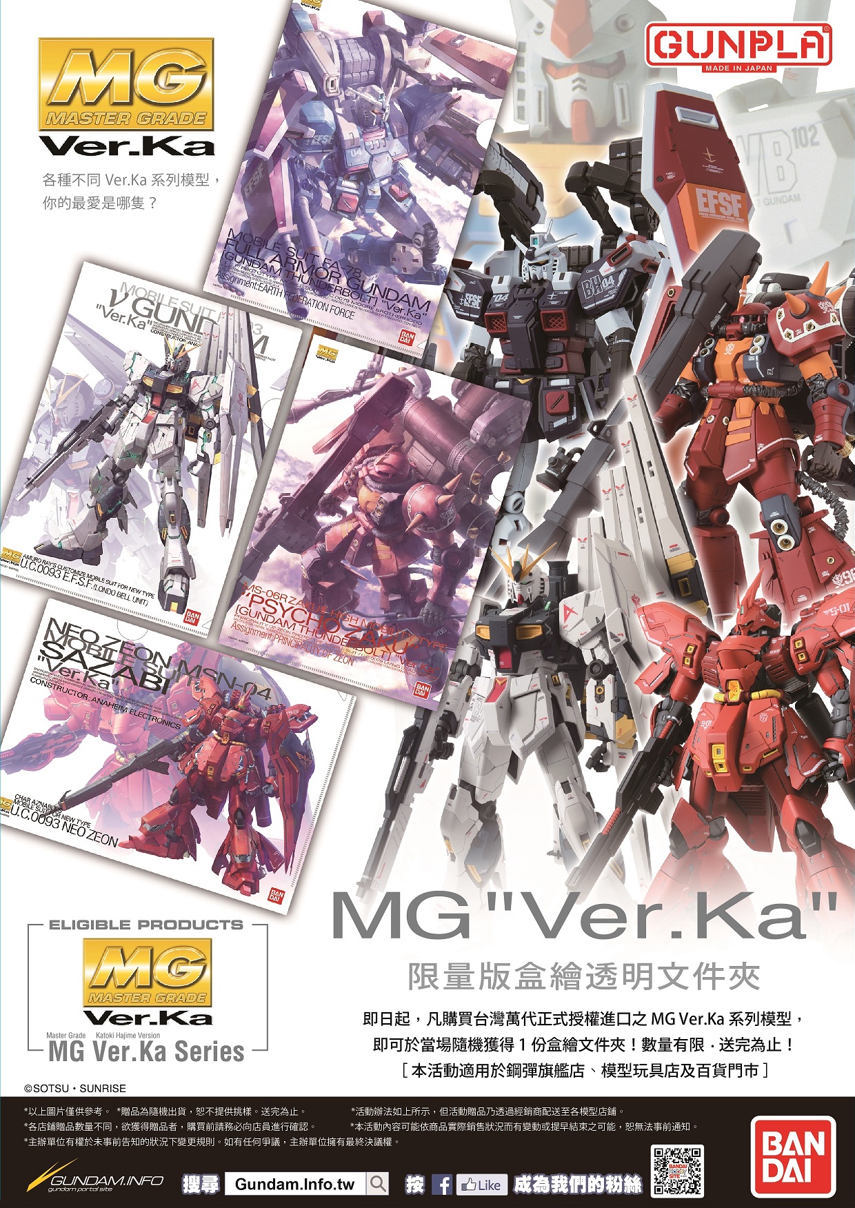 12月16日起,凡於模型玩具店、百貨門市、鋼彈旗艦店 購買台灣萬代正式授權進口之MG Ver.Ka系列模型, 即可於當場隨機獲得1份盒繪文件夾!數量有限˙送完為止!