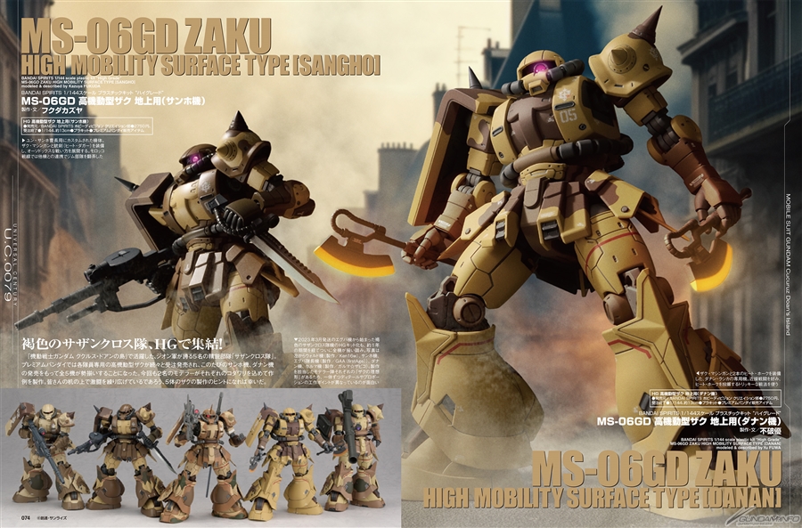 介紹來自『機動戰士鋼彈 庫克羅斯・德安之島』的「HG 1/144 高機動型薩克 地上用(尚昊機)&(達南機)」模範作品!由專業模型師Kazuya Fuquda和不破優製作。由於每個模型師擁有各自「理想中的薩克」,仔細介紹了每台不同細節和比例的作業重點。