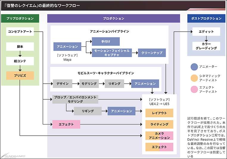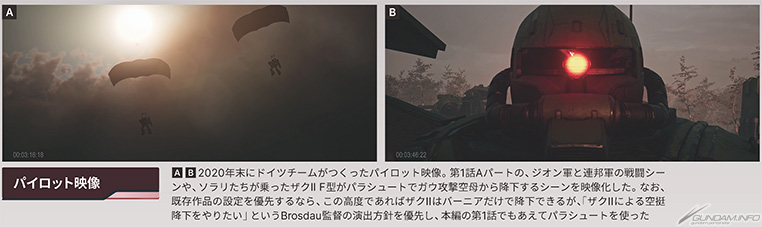 布羅斯達:與劇本製作同時進行的是由德國團隊製作試播影片,並驗證使用Maya和UE的工作流程,進行外觀開發。由於本作品用的素材在這個階段尚未完成,因此使用了製作中的素材以及BNF提供的『THE ORIGIN』等現有素材、市售素材。