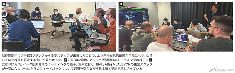 和Bandai Namco Filmworks(以下簡稱BNF)共同製作本作品的Atlas Ⅴ,是2017年成立專門製作沉浸式內容的巴黎製作公司。「本作品企劃是2021年由BNF的小形尚弘(執行製作人)和彌富健一(製作人)向Atlas Ⅴ接洽開始的。而且事前也受到了Meta “想製作使用著名IP作品,融合敘事和互動的VR電影” 的磋商,我認為日本的『鋼彈』是最合適的」Atlas V的Julien Bercy(製作人)這麼表示。