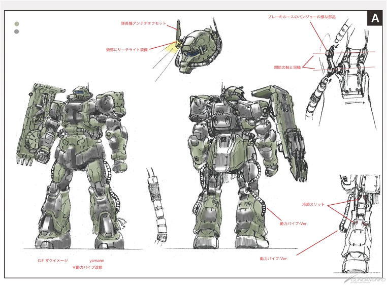 A:山根筆下的薩克II F型設計草稿。和後述的鋼彈EX成對比,帶有厚重感的設計。雖然第1稿中兩腳外側動力管線跟膝蓋有距離,但是因為戰鬥時會勾到樹木等物體的理由,變更成中間部分固定在膝蓋上的設計