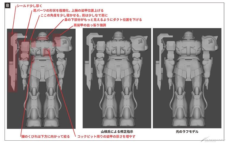 B:山根對粗略模型的修正指示。「不只修正體型平衡,連細節的斜角感、管線的彈性程度都提出了各種改善意見,讓我學了不少」(山下)