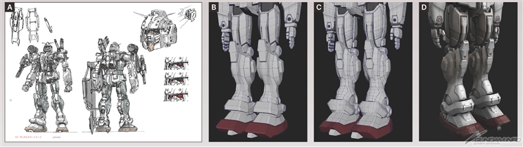 A:山根筆下的鋼彈EX設計草稿/B:修正前,C:修正後,D:完成模型的下肢前面。
