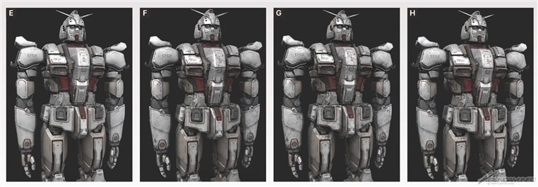 順帶一提,鋼彈系列的MS設計分為偏向角色以及偏向機械。例如『機動戰士鋼彈』和『水星的魔女』中的MS就是前者,『閃光的哈薩威』中的MS則是後者。本作品雖然是擬真風格,但是和『機動戰士鋼彈』同樣為一年戰爭時期的故事,所以採取“位於中間,但稍微偏向角色”的方向性,Bandai Namco Filmworks(以下簡稱BNF)於初期階段就決定了。