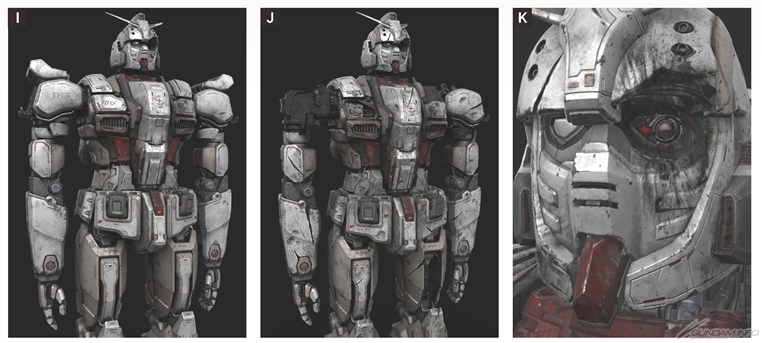 F~J:做了5架鋼彈EX的損壞版,配合各話的戰鬥狀況分別使用。「因為布羅斯達導演畫了好幾張各集的損壞版,所以就和笠岡(攝影指導 笠岡淳平)一起整理,篩選成5架。不單只是逐漸損壞,還做出了回基地整備後,重置1次減少汙損等調整」(鈴木)