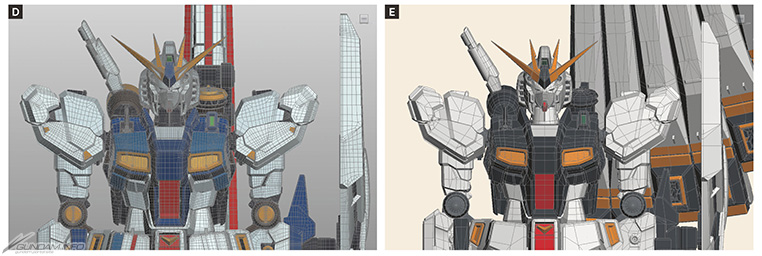 E:『銀灰的幻影』的ν鋼彈。面數約10.6萬、骨骼數為205。森田親自手工重新排列,並透過拓撲優化將面數壓縮至原來的四分之一以下。為了兼顧特效與後期效果的表現,製作團隊將每個場景的總面數上限設為100萬。考量到場景內可能會顯示多架MS與角色,他們為主要MS設定了10萬面數的上限,而其他次要MS則控制在7萬以內。「由於ν鋼彈擁有大量的細節,我們在壓縮面數時面臨了極大的挑戰。在保留其獨特細節的前提下,盡量將平坦區域合併為大型長方形多邊形,將面數削減到極限」(森田)
