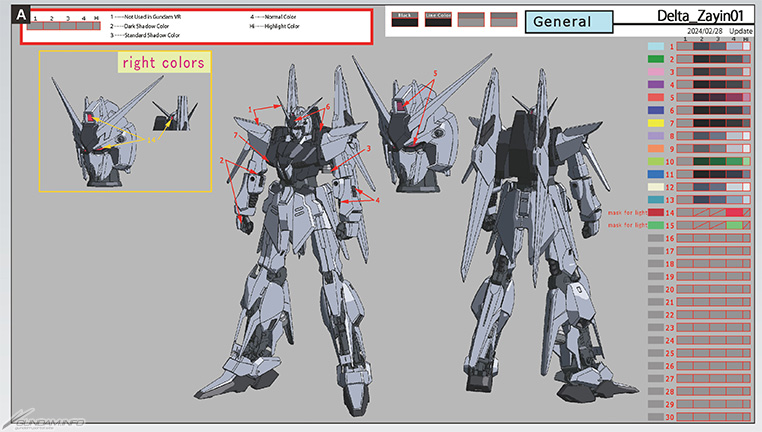 A:DELTA ZAYIN的色彩設計。於右側列出各處的2號陰影、1號陰影、普通色及高光色