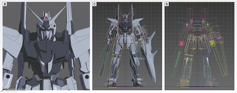 C・D:綁定則使用了CAT系統。骨骼數為173。在過去的動畫中,都是使用CAT綁定骨骼,再將下層綁定其他骨骼分層組成MS的各個零件,呈現出中彈時零件飛散的效果。但本作品為減少繪製調用的次數,將所有的零件一體化,並對單一骨架進行蒙皮操作。