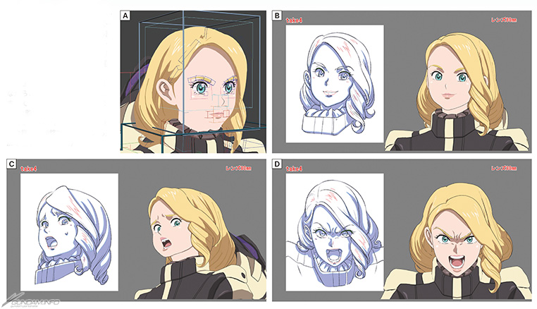 B~D:臉部第4版。一邊參照壽司的表情集,一邊遵循動畫師的意見不斷調整裝配。「鈴木導演對表情很講究,所以不只使用混合變形,還追加了可以微調眉毛及眼睛的骨架」(野本)