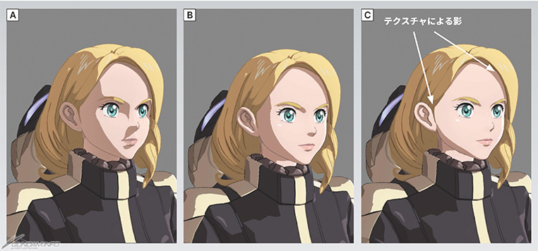C:必要時,也可以只減少落在臉部的陰影。此外,髮際等處的陰影是利用材質貼圖,落在眼球上的眼瞼陰影則是用Unity的簡單乘算著色來表現。