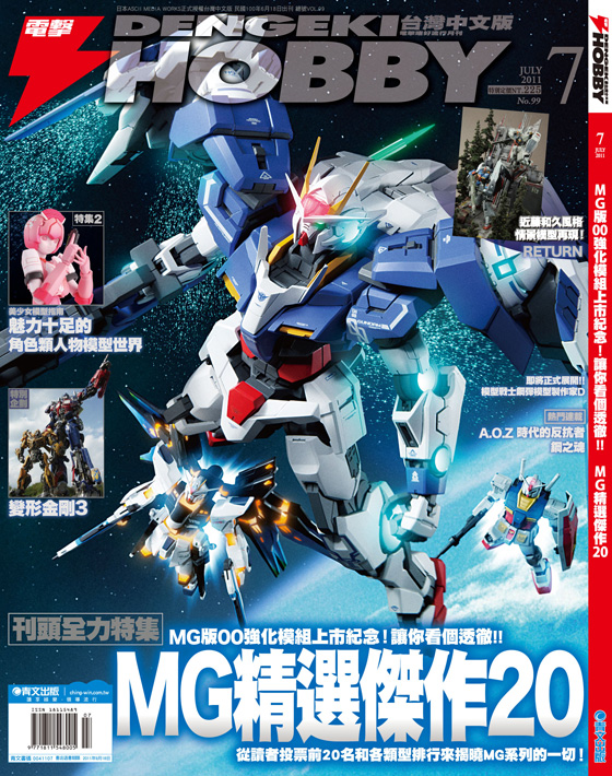 自從1995年7月MG版「RX-78-2鋼彈」發售以來,已經過15個年頭。MASTER GRADE(以下簡稱MG)系列的發行數超過140組,可說是銷售長紅的人氣系列。趁著本月MG的最新套件「00強化模組」發售的機會,除了本套件的完全攻略以外,並將以本誌5月號實施的讀者人氣排行榜為基準,刊載前3名的製作範例。其他還有外盒圖像BEST 20、編輯部調查的各類BEST排行榜、本誌模型師製作範例的BEST 20等,是為由各種方面來驗證MG的全力特集,敬請期待。