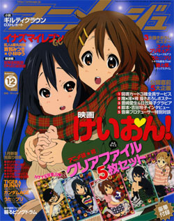 本月號的封面&大特輯為公開前的電影版『K-ON!輕音部』大特輯!在封面中登場的是唯和梓的組合☆ 兩人如姊妹般友好的插畫真是太棒了♪ 特輯首先為負責腳本的吉田玲子小姐訪談。以倫敦為舞台的劇場版中到底會發生什麼事呢?為各位問了各種令人在意的問題。飾演平沢唯的豊崎愛生小姐,和飾演秋山澪的日笠陽子小姐的附凹印相片訪談也不能錯過喔♥ 另外提到了『K-ON!輕音部』,就不能不提音樂。本次邀請到音樂製作人小森茂生先生與磯山敦先生進行對談。一面閱讀本雜誌的特輯,一面屈指倒數12月3日的公開日吧♪ 本月的電影版公開紀念特典附錄滿是『K-ON!輕音部』♥ 首先是附錄,電影版『K-ON!輕音部』超豪華透明資料夾5張一組♪ 竟然附有HTT的5人各1張A4尺寸透明資料夾。這些內容,粉絲們絕對要GET喔☆ 此外投稿者全員特別服務為電影版『K-ON!輕音部』的3種原創圖書卡。皆採用負責角色設計的堀口悠紀子小姐的美麗原畫插圖。並附唯×澪×梓的特別繪製海報,在觀賞電影版之前一定要把這1本帶回家♥ 特別海報為,『K-ON!輕音部』和另外3部。『Suite 光之美少女♪』的 “繆思天使&亞子”,『歌之☆王子殿下♪』的“時也&音也 Happy Duet★”,以及『少年同盟。』的“悠閒時刻♥”等超豪華陣容♥ 個個都是超高品質,讓人煩惱該貼哪一張♪ 另外特輯為搶先捕捉2012年1月的新節目☆ 『零之使魔F』和『BRAVE10』『輪迴的拉格朗日』等,網羅廣受期待的新作品☆ 另外還有『閃電十一人GO』的拓人&蘭丸對談,『機動戰士鋼彈AGE』的菲利特&沃爾夫對談、『Guilty Crown』的涯訪談等等,滿載只有「ANIMAGE」才有的魅力滿點企劃。也有刊載『Guilty Crown』的小說版喔♪ 充滿著各種亮點的「ANIMAGE」12月號,現在馬上到書店,GO!