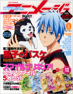 2013年的第一本ANIMAGE的封面為決定製作第2季TV系列動畫的『影子籃球員』,圖案是黒子與哲也2號可愛的2合照♥ 本期特集為聲優小野賢章與小野友樹以黒子&火神為題的兩位小野對談,以及多田俊介導演的訪談等內容,訴說對第2期動畫製作的想法與抱負。附錄為正要迎向劇情高潮的『光之美少女SMILE!』的透明資料夾豪華5枚套組。A4尺寸的光之美少女戰隊5人全部集結登場,只有ANIMAGE才會提供的豪華贈品♥ 『光之美少女SMILE!』報導內由本系列導演・大塚隆史與角色設定者川村敏江進行的最終對談絕對非看不可♪ 川村先生的插畫重點教學也包含在本篇報導中☆ 特製海報則是決定以製作續集的『K』為首,『玉子市場』『閃電十一人GO 時空之石』『卡片戰士!!先導者』這些強力的報導內容。『K』當中飾演周防尊一角的聲優津田健次郎的訪談以及擔任狗朗一色的小野大輔先生的短評作為作品回顧。『玉子市場』則是提供圖書禮券讓參加者通通有獎♥