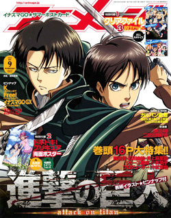 那部超強話題作『進撃的巨人』終於登上封面!封面為主角艾連和里維兵長的雙人照☆同一張圖片還另有特別附錄海報版喔。