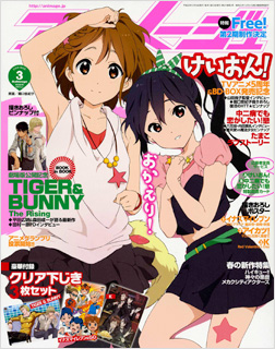 在Animage 3月號封面上登場的是睽違許久的『K-ON!輕音部』!實際上是因為『K-ON!輕音部』TV版動畫5周年☆而且第1期Blu-ray BOX發售的關係,唯&梓在過了約1年半後再次於封面上登場。內富山田尚子監督的口訊和堀口悠紀子小姐繪製的HTT全員集合海報喔♥這張插畫同時也是全部讀者都可申購的圖書卡圖案,就滿滿地沉浸在跟唯他們相關的回憶中吧。