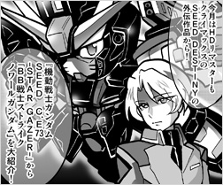 第3回是介紹『機動戰士鋼彈SEED』系列外傳作品『C.E.73 -STARGAZER-』裡所登場「BB戰士 漆黑攻擊鋼彈」。
