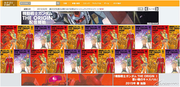綜合電子書籍商店「BOOK☆WALKER」上為了紀念「機動戰士鋼彈THE ORIGIN」的電子書上架,現在正舉辦只要購買第1集到第3集中的任一本書,就會贈送「GUNDAM ACE漫畫總合目錄2014(電子版)」的優惠活動。活動期間到9月25日(四)為止。