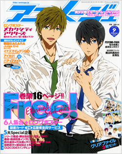 正值夏天! Animage 9月號的封面是『Free!‐Eternal Summer‐』的遙&真琴這對好朋友組合♥ 原畫是擔任角色設計的西屋太志☆ 肌膚上緊貼濕透的襯衫,2人可真是所謂「會滴出水的男孩」狀態☆ 他們加上渚・怜・凜・宗介等4人,6人版本的插畫是內封長型海報喔。而且這次的全員申購企劃,就是使用這張插畫的圖書卡喔。附錄也是『Free!‐Eternal Summer‐』,A4透明資料夾的豪華3枚組。刊頭特集是高達16頁的大份量,『Free!』的粉絲絕對不容錯過喔♪