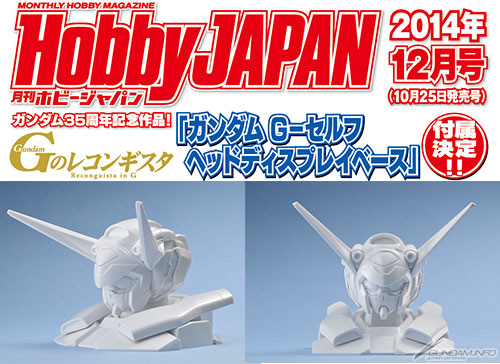 今年創刊屆滿45周年的月刊HOBBY JAPAN,在BANDAI HOBBY事業部的協力下推出了特別企劃,將在月刊HOBBY JAPAN的2014年12月號(10月25日發售,特別定價:1350円)附贈特別附錄鋼彈模型「鋼彈 G-自我 頭像展示座」!這個頭像展示作跟9月起發售的HG『鋼彈 RECONGUISTA IN G』系列模型完全連動,能夠展示包括第1彈的「HG鋼彈 G-自我(大氣圈用背包裝備型)」在內的各種「HG G-RECO」鋼彈模型!