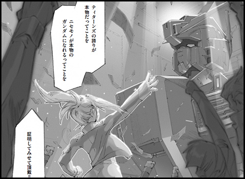 ▲作為複製人士兵求生的水野,將自身遭遇和換上鋼彈頭的「吉姆・鎮暴型」(海茲爾初期型)重疊。“贗品”究竟有沒有辦法成為“真品”呢?