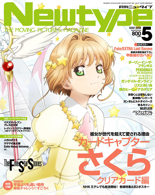 附錄為『庫洛魔法使 透明牌篇』和『Fate/EXTRA Last Encore』B2海報,以及紀念『比宇宙更遠的地方』完結的南極挑戰!雙六棋登場。請一定要來看看刊載滿滿最新動畫情報的「Newtype 2018年5月號」。