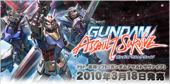 鋼彈突擊求生戰 發售日 : 2010年3月18日 平台 : PSP 價格 : 6,279日圓(含稅) 遊玩人數 : 1人(協力遊戲:2~3人、對戰遊戲:2~4人) 傾向/類別: 動畫/鋼彈動作 CERO : A(全年齡) 「鋼彈Battle」系列開發小組所帶來的新鋼彈動作遊戲!! 以3機小隊&歷代系列的各種場景實際體會「共同戰鬥」的樂趣吧! |