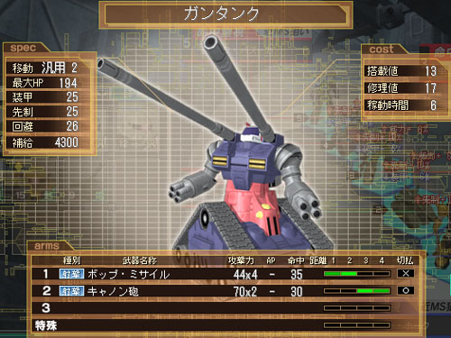 運氣非常好地虜獲任務成功了,終於獲得思念以久的鋼坦克。 因為在宇宙也可使用的關係,在遊戲進行到後半疑似也可以進行延遲編成,好像可以期待它的活躍。 雖說是這樣、像這種鋼坦克也好、索克也好、P古夫也好、 將這些沒什麼人氣的MS當做重點來販賣的遊戲阿… 難不成是開發者的個人喜好? 是時候該把修理値正式用上吧! 在導覽手冊中,明確記載了「修理値較高的機體獲得的戰果點數會變得比較少」 ,但是現在卻完全的感覺不出來。 能夠獲得的補給點數倒是有多少程度的影響。 因為如此,VP玩家和MP玩家都只是以力量為編成的主要目標、 完全看不出因為追求的方向不同,組成有什麼特別的變化反映出來。 尤其是本週的「原型古夫」,在序盤的地上戰中 可以開發出有著以破格的性能為傲的MS,只要將這台P古夫 早一點全部湊齊,勝負就可以輕易的決定了。 這樣不就讓好不容易有的新機種、S型和高機動薩克等,一點出場機會都沒有。 我熱切的希望,可以將遊戲規格調整成可以感受到各種編成樂趣的版本。