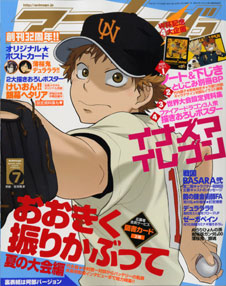 封面&刊頭為『王牌投手-振臂高揮~夏季大會篇~。封面為雙面的兩面彩圖豪華版!表面是三橋,裏面是阿部與西浦,投手與捕手佔領Animage的封面☆ 刊頭為終於迎接最高潮的西浦高中vs.美丞大狭山高中的比賽,將焦點放在比賽的去向,水島努導演訪談、飾演三橋的代永翼×飾演阿部的中村悠一,投手與捕手訪談等滿滿的大特集! 然後是讓人在意的應募者全員贈禮活動,使用封面插圖的兩種獨創圖書卡。「王牌投手」全員贈禮活動是Animage的首次♥!當作這個夏天的回憶,GET投手與捕手的圖書卡組吧! 在六月又要舉辦世界杯!Animage也燃起了對足球的熱血!!因為這樣所以本月大注目足球動畫「閃電十一人」。足球國境,目標國際性戰鬥的閃電十一人,Book in Book的徹底特集! 從滿載最新設定資料的選手名鑑開始到火龍3人眾的熱血海報,令人期待的滿載大特集。附錄為「閃電十一人」的墊板&筆記組合。邊使用這個與岡田JAPAN一起應援閃電十一人吧♪ 另外為了紀念創刊32週年,「薄櫻鬼」與「無頭騎士異聞錄」的獨創明信片也在附錄中登場!