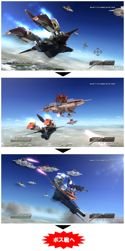 「追擊模式」當中將將動作轉為半自動模式、除了普通動作時的後方視點以外還有更多樣化的攝影角度來進行遊戲。玩家只要專心於「擊毀敵方機體」、「回避敵方的攻擊」、「高難度動作」等等指令,隨著追擊同時可以展開多様化的操作以完成任務。
