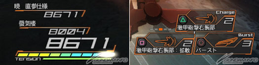 另外,「TENSION」表的儲存方式包含「時間増加型」、「攻擊増加型」等等、會隨著機體搭配的駕駛員而有所變化。