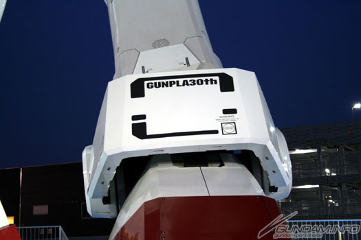 在全身的各個部位,印著全新的鋼彈30周年紀念標誌。「RG 1/144 RX-78-2鋼彈」等,在會場販賣的鋼彈模型,附屬著相同紀念標誌的轉印貼紙。